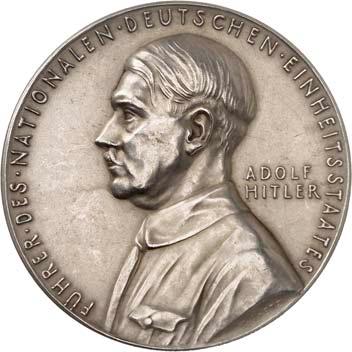 2143 Hitler, Adolf. *1889 Braunau, Ó1945 Berlin. Silbermedaille 1933, von F. W. Hörnlein, auf die Machtergreifung Hitlers. Köpfe Hitlers und Hindenburgs nebeneinander r.//Drei Zeilen Schrift unter Hakenkreuz. Mit Randpunze: SÄCHS. MÜNZE 999 f. 45,16 mm; 28,93 g. Colb./H. C-38. Mattiert. Vorzüglich 200,--