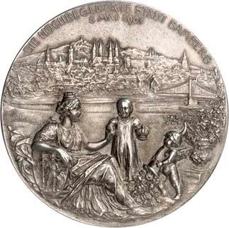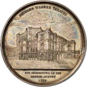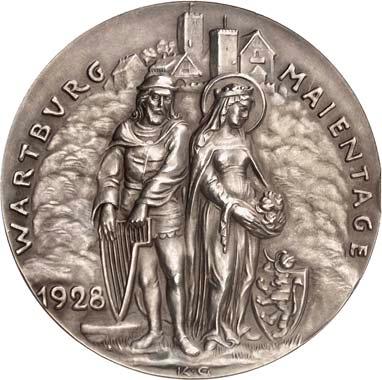 Silbermedaille 1928, auf das sechste Musikfest auf der Wartburg, anläßlich der Wartburger Maientage. Brustbild des Komponisten Richard Wilhelm Wagner, *1813 Leipzig, Ó1883 Venedig, und des Komponisten und Pianisten Franz von Liszt, *1811 Raiding (Burgenland), Ó1886 Bayreuth, einander gegenüber//Tannhäuser mit Harfe steht v. v., r. die heilige Elisabeth mit Rosen, vor ihr Wappenschild mit nach l. schreitendem Löwen, im Hintergrund die Wartburg. Mit Randpunze: BAYER. HAUPTMÜNZAMT. FEINSILBER. 65,34 mm; 79,14 g. Kienast 404. R Mattiert. Kl. Randfehler, fast prägefrisch 150,-Der Tannhäuser mit Harfe nimmt Bezug auf die auf der Wartburg spielende Handlung der Oper "Tannhäuser" von Richard Wagner, die heilige Elisabeth mit dem Wappen, auf das mit der Wartburg zusammenhängende Oratorium "Die heilige Elisabeth" von Franz Liszt.