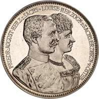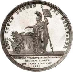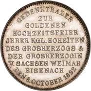 2123 Silbermedaille o. J. (1928), auf den Verein Ehemaliger des 94. Infanterie-Regiments. Brustbilder der Großherzöge von Sachsen-Weimar-Eisenach, Carl Alexander und Wilhelm Ernst, nebeneinander l., darunter ihre gekrönten Monogramme//Ansicht des Denkmals des 94. Infanterie-Regiments in Weimar. Mit Randpunze: BAYER. HAUPTMÜNZAMT. FEINSILBER. 35,90 mm; 24,63 g. Kienast 405. Von großer Seltenheit. Mattiert. Winz. Randfehler, fast prägefrisch 500,-Das 1927 feierlich eingeweihte Kriegerdenkmal, geschaffen vom Bildhauer Arno Zauche, wurde 1949 entfernt.