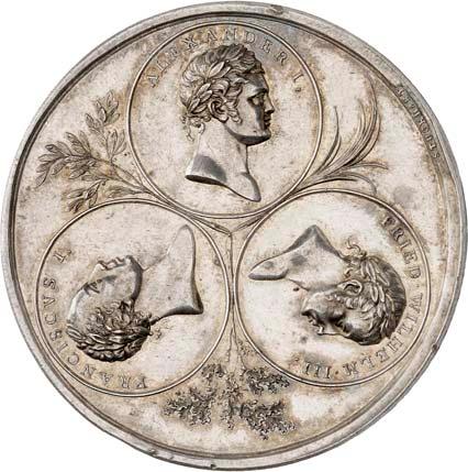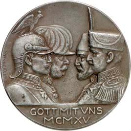2154 Silbermedaille 1915, von P. Sturm, auf das Bündnis zwischen dem Deutschen Reich, dem Osmanischen Reich und dem Kaiserreich Österreich-Ungarn. Die Köpfe der drei verbündeten Herrscher: Wilhelm II. und Franz Josef I. von Österreich einander gegenüber, unten der türkische Sultan Mohammed V. v. v.//Adler auf Eichenzweig, den Kopf l. gewandt. Mit Randpunze: SILBER 800. 34,15 mm; 17,27 g. Zetzmann 3033.Polierte Platte, min. berührt100,--