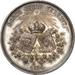 Silbermedaille 1916, von F. König, Werkstatt Lauer, auf das Bündnis mit Österreich-Ungarn, der Türkei und Bulgarien. Die Köpfe der vier verbündeten Herrscher: Franz Josef I. von Österreich, Wilhelm II. von Preußen, der türkische Sultan Mohammed V. und Ferdinand I. von Bulgarien nebeneinander r., darunter IM KAMPFE / VEREINT//Globus von zwei Schwertern durchbohrt, umher in acht Zeilen Schrift die Kriegserklärungen zwischen dem 1. August 1914 und dem 1. September 1916. Mit Randpunze: SILBER 990. 33,33 mm; 15,14 g. Zetzmann 3047. RR Prachtexemplar. Feine Patina, vorzüglich-Stempelglanz100,--