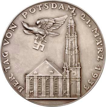 Silbermedaille 1933, auf die Eröffnung des Reichstages in der Garnisonkirche Potsdam. Adolf Hitler und Paul von Hindenburg reichen sich die Hände//Adler mit Hakenkreuz in den Fängen über Garnisonkirche. Mit Randpunze: BAYER. HAUPTMÜNZAMT. FEINSILBER. 59,77 mm; 57,55 g. Colb./H. C-36; Kienast 493. R Mattiert. Fast prägefrisch 750,--