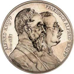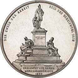 2147 Krupp, Alfred. *1812, Ó1887. Deutscher Großindustrieller. Silbermedaille 1892, von A. Scharff, Wien, auf die Errichtung des Alfred-Krupp-Denkmals in Essen. Sein Brustbild und das seines Sohnes, Friedrich Alfred Krupp, nebeneinander r.//Das Denkmal, darunter in einer Kartusche: ERRICHTET VON SEINEN / WERKSANGEHÖRIGEN / 1892. 42,36 mm; 36,27 g. Wurzbach 4786. Winz. Kratzer, vorzüglich +100,--