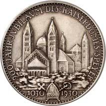 Silbermedaille 1930, auf die 900-Jahrfeier des Kaiserdoms in Speyer. Die Brustbilder von Konrad II., Heinrich III. und IV. nebeneinander r.//Ansicht des Doms. Mit Randpunze auf vertieftem Untergrund: BAYER. HAUPTMÜNZAMT. FEINSILBER. 59,94 mm; 59,63 g. Kienast 452. Mattiert. Fast prägefrisch 150,--