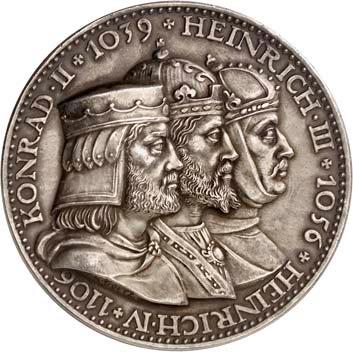 Silbermedaille 1930, auf die 900-Jahrfeier des Kaiserdoms in Speyer. Die Brustbilder von Konrad II., Heinrich III. und IV. nebeneinander r.//Ansicht des Doms. Mit Randpunze: BAYER. HAUPTMÜNZAMT. FEINSILBER. 36,18 mm; 19,60 g. Kienast 452.Mattiert. Fast prägefrisch 100,--