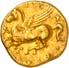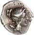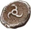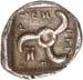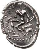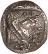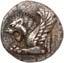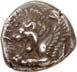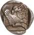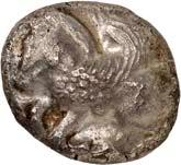 Around 480 BC, the incusum on the coins gave way to reverse images. On the obverse, the wild boar theme still occupied a large space; however, other animal images gradually appeared, some of which were based on Greek coin designs. The triskeles or tripod, on rarer occasions also a quadruped/tetraskeles, were symbols of fast rotation, i.e. tremendous speed, and could be associated with many rapid processes, such as the course of the sun during the year. People in antiquity were also fascinated by speed, and their imagination found ways to express what must almost be referred to as an exhilaration of speed. This is why many animals on Lycian coins have wings: there are winged wild boars, lions, horses, bulls and stags. By adding wings, animals that were already fast by nature were transformed into mythical creatures, and often into monsters as well. In some cases, such depictions may have been based on oriental models. This also applies to the sphinx, which appears on Lycian coins. Gradually, deities were also depicted on coins. They appear in Greek iconography and, despite their Greek imagery, were probably associated with Lycian concepts of gods. Of particular significance is the monetary depiction of Athena and her owl, as it testifies to the growing influence of the Athenians on Lycia (cf. Vismara 1996, 143-161: Tipologia; Müseler 2016, 10-27: Bildprogramme und deren geographische Zuordnung).