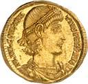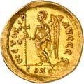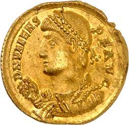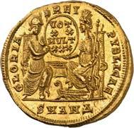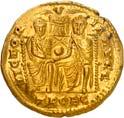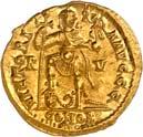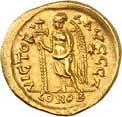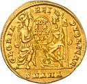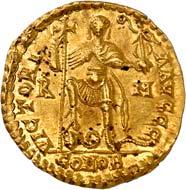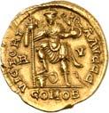 1016Ô-Solidus im Namen des Valentinianus III., um 435, gallische Münzstätte; 4,35 g. Drapierte Büste r. mit Diadem//Kaiser steht v. v. mit Langkreuz und Victoria auf Globus, Fuß auf menschenköpfiger Schlange. RIC 3776.Kl. Kratzer auf dem Avers, kl. Randfehler, gutes sehr schön1.000,-Exemplar der Auktion Leu Numismatik 7, Winterthur 2020, Nr. 2062 (dort mit Provenienz Joel L. Malter Auction 1, Encino (LA) 9.-11. November 1973, Nr. 442).