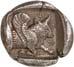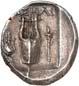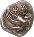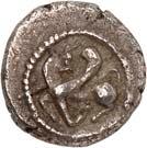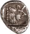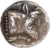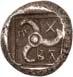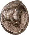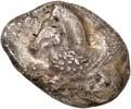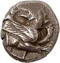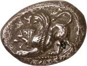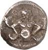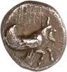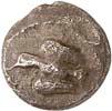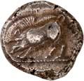 Around 520 BC, the dynasts began to mint their own coins based on Greek models. The influence of Phaselis is likely to have played a role in this. The reverse sides of these earliest Lycian coins were still designed as incusum, while most obverses depicted the front part of a wild boar. When reflecting on the choice of this motif, it should be remembered that wild boars were also a popular motif in Greek coinage. On early coins of Phaselis, the wild boar appears in the form of the prow of a Phaselite ship. In addition, the abundance of wild boars in Lycia meant that this coin design was anchored in the Lycian way of life. As wild boars caused great damage to agriculture by destroying fields and vineyards, the dynasts were forced to organize protective hunts in order to secure the farmers' yields and thus the taxes they had to pay in kind (cf. Nollé 2001).
