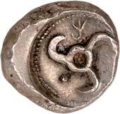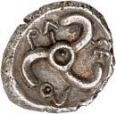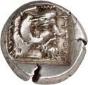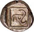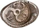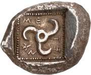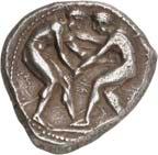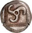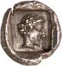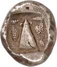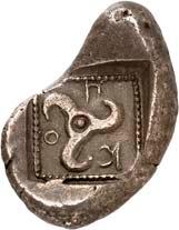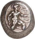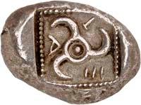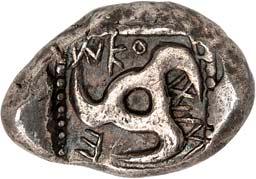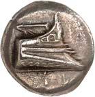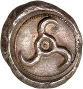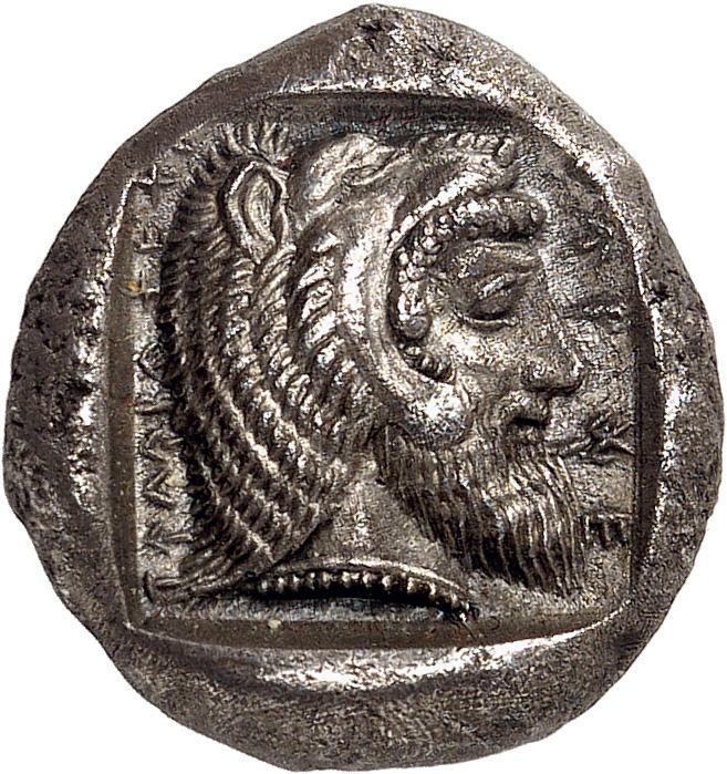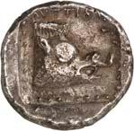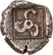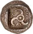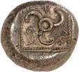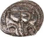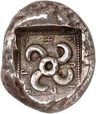 3Õ-Stater, um 500 v. Chr., unbestimmte Münzstätte; 9,14 g. Eberkopf r.//Vielfach geteiltes Incusum mit Zentralpunkt. Müseler I,7 (dies Exemplar). R Herrliche Patina, fast vorzüglich/sehr schön300,-Exemplar der Auktion Hirsch Nachf. 194, München 1997, Nr. 278 und der Auktion Lanz 117, München 2003, Nr. 376.