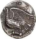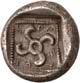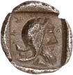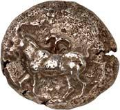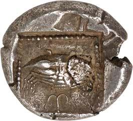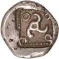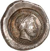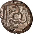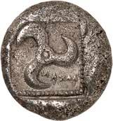 4Õ-Stater, um 500 v. Chr., unbestimmte Münzstätte; 9,16 g. Eberkopf r.//Achtfach geteiltes Incusum. Müseler I, 8 (dies Exemplar). Von großer Seltenheit. Herrliche Patina, gutes sehr schön400,-Exemplar der Auktion NAC O, Zürich 2004, Nr. 1644.