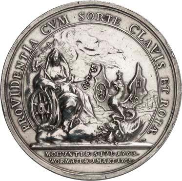 2657Bronzemedaille 1664, von J. Mauger, auf die Rückgabe der Stadt Erfurt an das Mainzer Erzbistum, mit Unterstützung durch französische Truppen. Gallia steht halbr. und hält die nach r. kniende, den Erfurter Schild haltende Stadtgöttin am Arm, vor ihr steht der Erzbischof mit offenen Armen, r. lehnt der Mainzer Wappenschild//Büste Ludwigs XIV. von Frankreich r. 41,34 mm; 27,93 g. Divo - ; Leitzmann -; Slg. Pick I (Auktion Dr. Busso Peus Nachf. 405) -; Slg. Walther -.Vorzüglich150,-Exemplar der Slg. Friedrich Popken, Auktion Fritz Rudolf Künker 237, Osnabrück 2013, Nr. 2145.