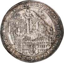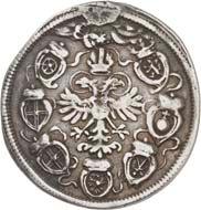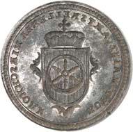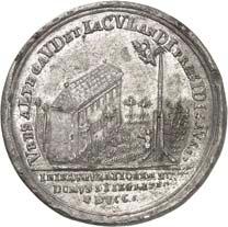 2658Zinnmedaille 1724, von P. P. Werner, auf die Fertigstellung des Neuen Schützenhauses. Zwei Säulen mit Medaillons der Brustbilder des Kurfürsten von Mainz (Lothar Franz von Schönborn) und dem Statthalter von Erfurt (Friedrich Wilhelm von Bicken) angebracht, in der Mitte eine Palme, im Hintergrund die Stadtansicht von Erfurt//Ansicht des neuerbauten Schützenhauses mit Hof und Vogelstange mit Adler. 35,00 mm; 15,00 g. Leitzmann 829 (dort in Silber); Slg. Peltzer -; Slg. Pick I (Auktion Dr. Busso Peus Nachf. 405) -. RR Sehr schön100,--