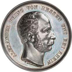 Als engagierter Sammler von Münzen und Medaillen erstellte Prinz Alexander eigens die Kataloge seiner Bestände der hessischen Prägungen sowie des Erzbistums und der Stadt Mainz, die in seinen letzten Lebensjahren erschienen: Hessisches Münzcabinet des Prinzen Alexander von Hessen. Darmstadt 1877; I. Nachtrag zum Catalog des Hessischen Münzcabinets des Prinzen Alexander von Hessen. Darmstadt 1881; II. Nachtrag zum Catalog des Hessischen Münzcabinets des Prinzen Alexander von Hessen. Darmstadt 1885; Numismatisch-Genealogische Serien. Schloss Heiligenberg 1889. Die hessischen Münzen seiner Kollektion vermachte er dem Museum in Darmstadt, die Versteigerung seines übrigen numismatischen Nachlasses erfolgte am 21. Oktober 1889 und folgende Tage durch Leopold und Leo Hamburger in Frankfurt am Main. Zu dieser Veranstaltung wurde nicht nur ein Katalog mit den Spezialsammlungen Hessen und Mainz (siehe unsere Kat.-Nr. 2672), sondern zudem auch ein weiterer herausgegeben, der die Varia und schwedischen Medaillen aus dem Bestand des Prinzen Alexander erfasst, aber auch Prägungen von der Antike bis zur Neuzeit dokumentiert, die aus dem Besitz weiterer Sammler stammen. Die Auflösung seiner numismatischen Bibliothek führte die Firma L. & L. Hamburger im Rahmen ihrer Auktion vom 4.-5. Oktober 1899 durch.