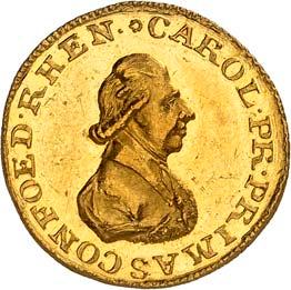 3320 Carl Theodor von Dalberg, 1804-1810. Dukat 1809. 3,47 g. Münzmeister Georg Christoph Busch. › CAROL Û PR Û PRIMAS CONFOED Û RHEN Û Brustbild r.//DUCATUS RATISBON Ü Mainzer Wappen auf gekröntem Wappenmantel, dahinter Schwert und Krummstab, unten die Jahreszahl 1809. Divo/S. 176; Fb. 2576; Schl. 655; Slg. Bach (Auktion Künker 238) -. GOLD. Von großer Seltenheit. Sehr attraktives Exemplar, vorzüglich20.000,--