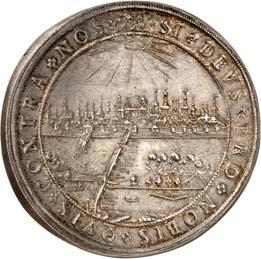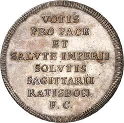 Laut Münzakten 1.200 Exemplare geprägt. Hübsche Patina, vorzüglich-Stempelglanz400,-3270 Silbermedaille in der Größe eines 1/2 Konv.-Talers 1763, von J. Chr. Busch und J. N. Körnlein, auf den Frieden von Hubertusburg, gewidmet von der Regensburger Stahlschützengesellschaft. Globus auf Altar, oben Kranz//Acht Zeilen Schrift. 34,43 mm; 14,03 g. Beckenb. S. 407; Pax in Nummis 614; Plato 184; Slg. Bach (Auktion Künker 238) 4846; Slg. Peltzer 1612. Prachtexemplar. Hübsche Patina, vorzüglich-Stempelglanz200,-Am 5. September 1763 veranstaltete die Regensburger Stahlschützengesellschaft ein Friedensfest mit Vogelschießen anläßlich des Hubertusburger Friedensschluß und der Hundertjahrfeier des 1663 begonnenen Reichstages.