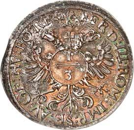 3287Konv.-Taler 1766, mit Titel Josefs II., auf seine Huldigung. 29,15 g. Münzmeister Georg Christoph Busch. Stempelschneider der Vorderseite Johann Leonhard Oexlein, der Rückseite vermutlich Georg Christoph Busch. MON Û REIP Û - RATISPON Û Stadtschlüssel in Rokokokartusche, die mit Lorbeerund Palmzweig besteckt ist, darauf Adler mit Lorbeer- und Palmzweig im Schnabel, Reichsapfel und Zepter in den Fängen, unten Jahreszahl 1766//IOSEPHVS II Û D Û G Û ROM Û IMP Û SEMP Û AVG Geharnischtes Brustbild r. mit Lorbeerkranz und umgelegter Kette des Ordens vom Goldenen Vlies, darunter Stempelschneiderzeichen B Ü F Ü. Beckenb. 7108 (dieses Exemplar); Dav. -; Slg. Bach (Auktion Künker 238) -. Von allergrößter Seltenheit. Kl. Kratzer, vorzüglich-Stempelglanz10.000,-Exemplar der Slg. Julius Jenke, Auktion Beckenbauer 1, München 1961, Nr. 90. Die Prägung des vorliegenden Stücks kann frühestens 1780 vorgenommen worden sein, da der Rückseitenstempel in dieses spätere Jahr gehört (siehe Beckenb. Nr. 7116). 1782 wurden laut den Münzakten 277 Konv.-Taler "mit dem Spiegel" durch den Münzmeister Georg Christoph Busch geliefert. Es handelt sich dabei vermutlich um den Konv.-Taler mit dieser Vorderseite (siehe hierzu Beckenb. S. 396).