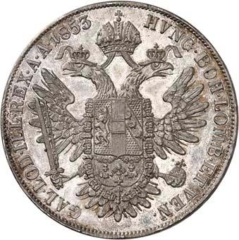 55271/2 Konv.-Taler (Gulden) 1853 A, Wien. 12,98 g. Die Blätter des Lorbeerkranzes zeigen auf die Buchstaben AV (in AVSTRIA). J. 295. RR Prachtexemplar. Hübsche Patina, winz. Kratzer, fast Stempelglanz750,--