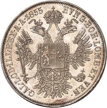 55291/2 Konv.-Taler (Gulden) 1855 A, Wien. 12,98 g. J. 295. Sehr selten, besonders in dieser Erhaltung. Prachtexemplar. Hübsche Patina, Erstabschlag, fast Stempelglanz (Prooflike)1.000,--