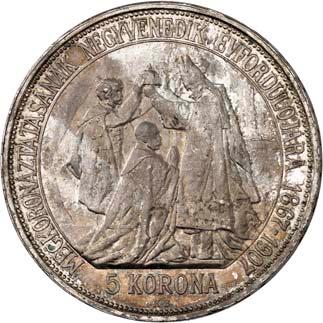 61075 Korona 1907 KB, Kremnitz, auf das 40jährige Krönungsjubiläum als König von Ungarn. 23,96 g. Dav. 124; J. 416. Prachtexemplar. Hübsche Patina, fast Stempelglanz100,--