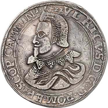 Exemplar der Slg. Theobald Seitz, Auktion Leipziger Münzhandlung 93, Leipzig 2019, Nr. 4267; der Auktion Lanz 119, München 2004, Nr. 671 und der Auktion Fritz Rudolf Künker 346, Osnabrück 2021, Nr. 351. Uns ist nur ein weiteres Exemplar dieses äußerst seltenen Talers bekannt; es stammt aus der Slg. Friederich, die am 5. Oktober 1896 bei Adolph Hess, Frankfurt/Main unter der Nr. 132 versteigert wurde. Lothar Koppe merkt in seinem Werk "Die Münzen des Hauses Sachsen-Weimar, 1573 bis 1918" (Regenstauf 2007, S. 223) folgendes an: Der einzige gemeinsame Taler der drei herzoglichen Brüder Wilhelm, Albrecht und Ernst wurde 1639 in Coburg geprägt. Coburg gehörte nach dem Erlöschen des Fürstentumes Coburg-Eisenach (1638) kurzzeitig zu Sachsen-Weimar. Vermutlich ist die Nutzung der Coburger Münzstätte, wie die Prägung dieses Talers überhaupt, nur zu dem Zweck erfolgt, in dem weit entfernten neuen Landesteil Flagge zu zeigen und die Besitzergreifung auch auf diesem Wege sichtbar und "begreifbar" zu demonstrieren.