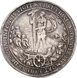 408Biblischer Taler o. J., Altona. 28,76 g. DIE ROTE HVR DE Û DRACH Ù REIT Ü DE KELC Ù DS GIF Ù U Ù GREWELS Û TREIT Ü « (Christoph Feistell, Münzmeister in Altona 1618-1620) Auf einem siebenköpfigen Drachen reitet ein geschmücktes Weib (das Symbol Babylons) r. über Stadtmauer, in der erhobenen Linken ein Kelch, unten eine Heuschrecke und ein Lamm, das dem Drachen entgegenspringt//HATS Û GODT Û VO Û - RSEHN Û SO Ü WI - RTS Û GESCHEN Û ( ~ Undeutliches Zeichen) Der Graf in voller Rüstung reitet r., in der Rechten Kommandostab, unten Blumen. Lange 837; Weinm. 152. Sehr attraktives Exemplar mit hübscher Patina, kl. Schrötlingsfehler am Rand, vorzüglich15.000,-Exemplar der Auktion UBS 76, Zürich 2008, Nr. 2018 und der Auktion Fritz Rudolf Künker 244, Berlin 2014, Nr. 315.