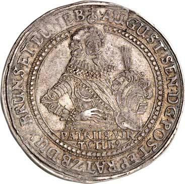 Exemplar der Auktion Fritz Rudolf Künker 100, Osnabrück 2005, Nr. 885. Weil die Stadt Stralsund nicht bereit war, die kaiserliche Obergewalt anzuerkennen, eine kaiserliche Garnison in die Stadt zu lassen und gegenüber der kaiserlich-wallensteinischen Seite eine wohlwollende Neutralität einzunehmen, erschienen im Mai 1628 kaiserliche Truppen vor der Stadt Stralsund, die von drei Seiten von der Ostsee und Sümpfen natürlich geschützt war. Am 12. Mai 1628 standen sich 2.500 Mann auf städtischer Seite und ungefähr 8.000 kaiserliche Soldaten gegenüber. Es begann eine heftige Belagerung Stralsunds, die Anfang Juli von Wallenstein und seinen Soldaten noch verstärkt wurde. Die Stadt wurde seit Ende Mai 1628 von dänischen und schwedischen Hilfstruppen unterstützt. Am 24. Juli 1628 konnte unter Vermittlung des pommerschen Herzogs Bogislaw XIV. die Aufhebung der Belagerung und der Abzug der kaiserlichen Truppen erreicht werden. Die Stadt Stralsund hatte einen Bündnisvertrag mit Schweden abgeschlossen, und von 1637 bis 1814 war Stralsund Teil des schwedischen Reiches. Der hier angebotene, sehr seltene Doppeltaler erinnert an die Befreiung der Stadt von der Wallensteinischen Belagerung und ist ein eindrucksvolles, historisches Dokument des Dreißigjährigen Krieges.