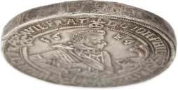 417Reichstalerklippe (32 Schilling) 1623, mit Titel Ferdinands II. 29,25 g. (Münzzeichen des Münzmeisters Asmus Riekhof) Ú MONETA r r NOVA r STRALSVNDENSIS Ú Strahl, darunter Kreuz, oben zu den Seiten die geteilte Jahreszahl 16 - Z3//FERDINANDVS Û I Û I Û D Ù G Ù ROM Ù IMP Ù SEM Ù AVG Ù Gekrönter Doppeladler, auf der Brust Reichsapfel, darin Wertzahl 3Z. Bratring 38 c; Dav. 5821 Anm.; Slg. Pogge 1448 (dieses Exemplar).