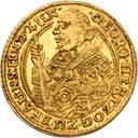 4022 Dukaten 1621. 6,92 g. Ú IOHANN Û GEORG - D Ù G - MARCHIO Ú BRAND Ú Der geharnischte Herzog steht nach r., die Rechte in die Hüfte gestemmt, die Linke am Schwertgriff// Ú DVX Û CARNOVIENSIS Û 62I Ú Gekröntes und verziertes, ovales 12feldiges Wappen. F. u. S. 3390; Fb. 3128 (dieses Exemplar). Vorzüglich-Stempelglanz10.000,-Exemplar der Auktion Fritz Rudolf Künker 171, Osnabrück 2010, Nr. 5824.