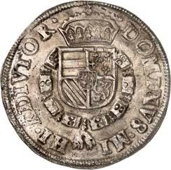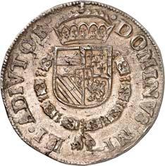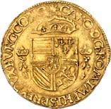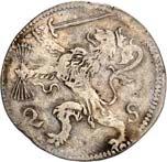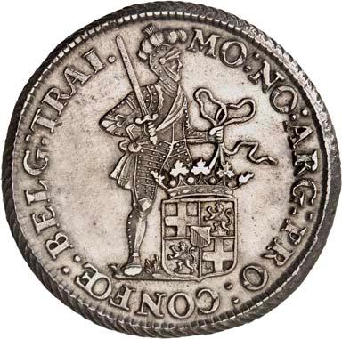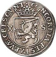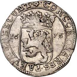 Û DNS Û FRI Û INT Û AMA Û Z Û LAVR Û Geharnischtes Hüftbild l., die Rechte am Schwertgriff, mit der Linken das Zepter schulternd// Û CONCORDI - A Û RES Û PARVÆ Û - CRESCVNT Û Gekröntes, fünffeldiges Wappen (Hunsingo, Fivelgo, Humsterland, Vredewold, Langewold) mit Mittelschild der Umlande, von zwei Löwen gehalten, oben die geteilte Jahreszahl 15 - 79. CNM 2.19.2; Dav. 8502; Delm. 139 (R4); JMP 1915, S. 130-138; Purmer Om 02; v. G./H. 258-18; Vanhoudt 412 APPINGEDAM (R4). Von allergrößter Seltenheit. Kl. Schrötlingsfehler, sehr schön5.000,-Erworben im Januar 1957 von Jacques Schulman, Amsterdam. De Ommelanden (Friesland tussen de Eems en de Lauwer) hadden zich in 1577 van Groningen afgescheiden en vestigde de 1e Ommelander regering in het najaar van 1578. In 1579 werd Hendrik van Velthuysen als muntmeester aangesteld en werd de Munt te Appingedam gevestigd, die reeds in juni 1580 eindigde door de vlucht van de Staten der Ommelander door het 'verraad van Rennenberg'.