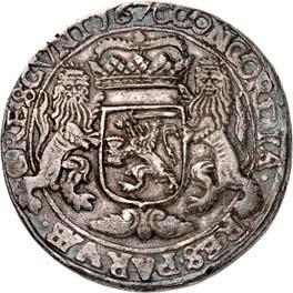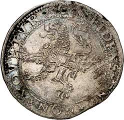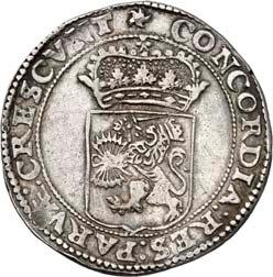 5227Reichstaler (Gehelmde Rijksdaalder) 1589, Culemborg. 27,12 g. Münzzeichen Säule. Münzmeister Hendrik Craeycanger. Unbekannter Stempelschneider. Behelmtes, vierfeldiges Wappen (Humsterland/ Fivelgo) mit Mittelschild der Umlande//Hüftbild eines Edelmannes mit Klappmütze r., in der Rechten ein Schwert haltend, zu den Seiten die geteilte Jahreszahl 15 - 89. CNM 2.19.15; Dav. 8836; Delm. 727 (R3); Purmer Om 10; JMP 1915, S. 167. Von großer Seltenheit. Feine Tönung, sehr schön +5.000,-Ex. Stephanik, Nr. 3653. Exemplar der Slg. Howard D. Gibbs II, Auktion Leu/Hess 6, Luzern 1957, Nr. 1550. Omschrift voorzijde betekent: Nieuwe zilveren munt van de Staten van Friesland tussen de Eems en de Lauwerszee op de voet van de Hollandse.