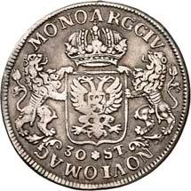 5201Florin (28 Stüber) / Florijn van 28 Stuiver 1692, mit Gegenstempel der Generalstaaten (von 1693) auf der Vorderseite: Pfeilbündel. 18,07 g. Münzzeichen Wassermann. Münzmeister Egbert Marinus. Unbekannter Stempelschneider. CNM 2.21.55; Delm. 1121 (dort ohne Gegenstempel); Purmer Gr 03 (dort ohne Gegenstempel).Fast sehr schön75,-Zu den Gegenstempeln auf diesem und den beiden folgenden Stücken siehe die Anmerkung zu Nr. 4247.