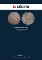 Unsere Winter-Auktionen beginnen am 10. November mit einer Spezialsammlung China aus der Sammlung einer Sinologin aus altem Familienbesitz. Vom Käsch aus dem 6. Jahrhundert n. Chr. über die Neugestaltung des chinesischen Münzwesens um die Wende zum 20. Jahrhundert bis hin zu den modernen Prägungen Chinas wird der Freund der chinesischen Numismatik viel Aufregendes finden. Die Preise reichen dabei vom zweistelligen bis zum fünfstelligen Bereich. Um den Gepflogenheiten des asiatischen Marktes entgegenzukommen, wurde ein großer Teil der Münzen gegradet, und zwar vor allem die Münzen, die maschinell hergestellt wurden.