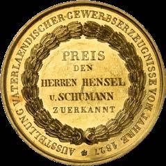 It was awarded to the Prussian court supplier Hensel und Schumann. This is fitting, as Hensel und Schumann was a gold and silver manufacturer that was one of the most technologically advanced companies in the world at the time. The Brandenburg Royal Academy used only chemically pure gold and silver from Hensel und Schumann for scientific analysis. The best-selling product was Lyon gold and silver. This fabric surrounded by metal wires was an indispensable part of any impressive uniform in the 19th century. By the way, there is a second gold medal of 25 ducats from the Hahn Collection, which was also awarded to this company. It is also extremely rare. Only 69 specimens were produced.