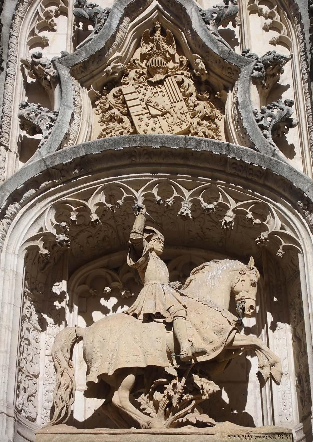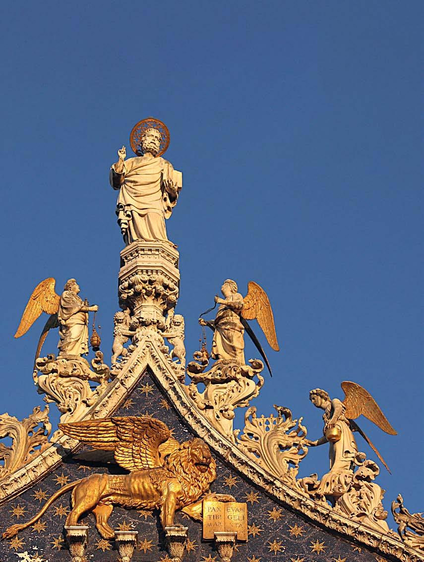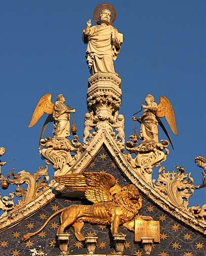 The Lion of Saint Mark and the statue of Saint Mark above it. Central portal of Basilica di San Marco in Venice (Photo Ulrich Heide).