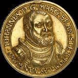 Brandenburg. Margrave John of Küstrin, 1535-1571. Gold cast medal, 1569. From the Gunther Hahn Collection. Extremely rare. Minor trace of mounting. Fields finely chased. Extremely fine.