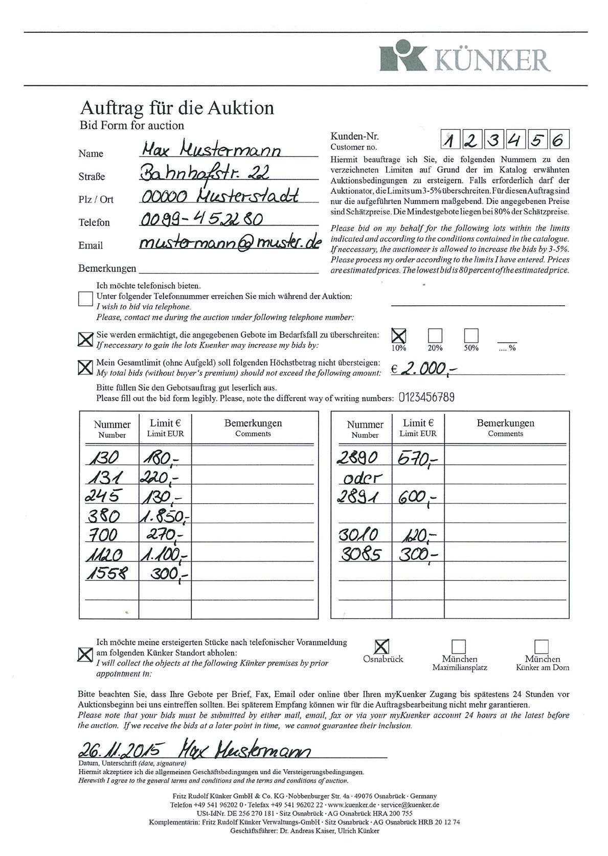 Please browse our auction catalogues at www.kuenker. com, www.sixbid.com and kuenker.auex.de. You will have the possibility to zoom all images, to place your bids and to view all auction results online.