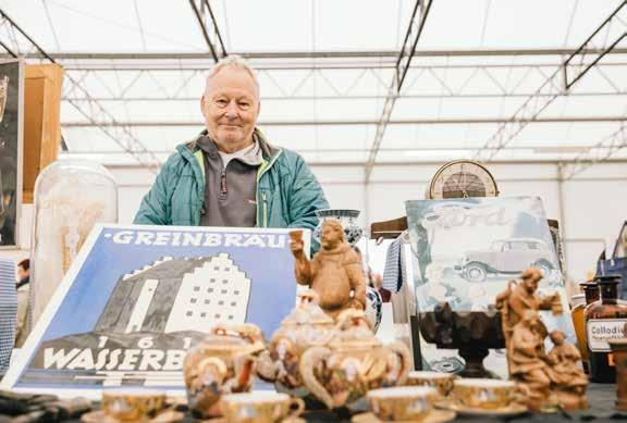 regional differences are extreme. Twenty kilometres further on, I wouldn‘t be able to offer these items. Nobody would be interested,’ reports Helmut. When asked about pricing, he says: ’You can negotiate with me. That‘s just part of the market, and I like that. It gets you talking, you meet new people, and that‘s why I love this hobby so much.’ After we leave Helmut‘s stand and stroll past the toys and clothing towards the book corner, we hear the sounds of an accordion. Someone who sells instruments can also play them and, without further ado, plays a serenade.