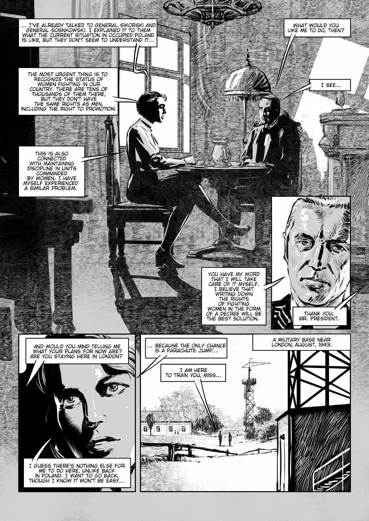 At the beginning of 1943, as an emissary of Commander-in-Chief of the Home Army, General Stefan “Grot” Rowecki, she was transported to London. One of the purposes of the mission was to have the Polish authorities settle the issues connected with women’s service in the Home Army. Elżbieta Zawacka underwent an appropriate parachute training and returned to Poland in September, 1943, dropped with a parachute together with the Home Army paratroopers, Cichociemni. She then continued her underground activity and participated in the Warsaw Uprising.