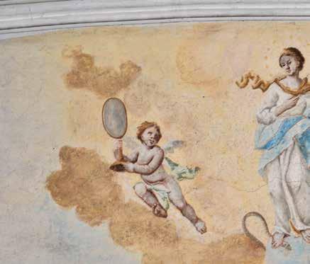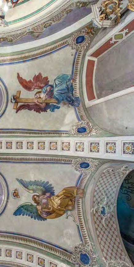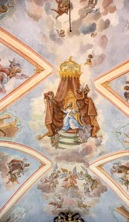 sklepiennych zobrazowano personifikacje czterech cnót życia zakonnego: Wiary, Miłosierdzia, Milczenia i Pokory. Nieco dalej możemy dojrzeć scenę triumfu Maryi. Przedstawiono na niej Matkę Bożą siedzącą na obłoku. Nad Maryją unosi się Trójca Święta. Spoglądając na pendentywy sklepienia, ujrzymy natomiast personifikacje czterech kontynentów: Europy, Azji, Afryki oraz Ameryki. Na sklepieniu prezbiterium widzimy z kolei scenę nawiedzenia św. Elżbiety. Została ona ukazana na tle fantastycznej architektury nawiązującej do czasów starożytnych. Centralną postacią jest tu brzemienna Maryja. Święta Elżbieta klęczy przed Nią i jednocześnie Ją obejmuje. Towarzyszą im św. Józef oraz św. Zachariasz. Interesującą scenę namalowano też za ołtarzem. Widzimy tam adorację Matki Bożej przez św. Franciszka z Asyżu. Ponadto na zaplecku ołtarza przedstawiono fantastyczną architekturę, a wokół okna rozbudowany ornament muszlowy. Przejdźmy teraz do sklepień naw bocznych. Namalowano na nich sceny z ż ycia Matki Bożej. W nawie południowej przedstawiono narodzenie