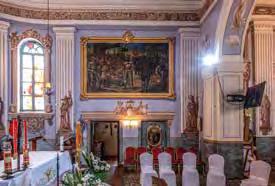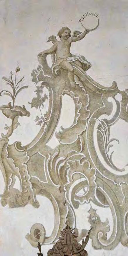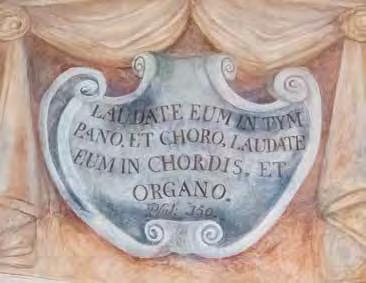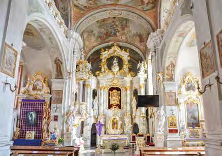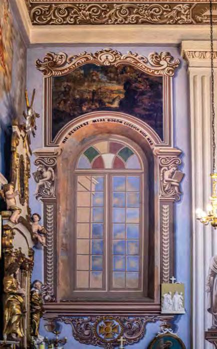 Po wejściu do kościoła odwróćmy się na chwilę w stronę chóru. Zobaczymy wówczas wyjątkowo ozdobny, malowany rokokowy portal stworzony w monochromatycznej technice en grisaille. Natomiast podnosząc głowę, na podniebieniu empory organowej ujrzymy muzykujące anioły oraz motywy pejzażowe.