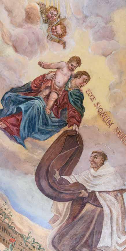 Teraz przenieśmy wzrok na sklepienie nawy głównej. Zobaczymy tam postać przyklękającego św. Franciszka z A syżu, który wznosi głowę ku niebu. Przed nim na skale znajduje się otwarta księga z napisem: „DEUS MEUS ET OMNIA MEA” (Bóg mój i wszystko moje). Obok świętego widzimy drugiego franciszkanina, natomiast na żagielkach