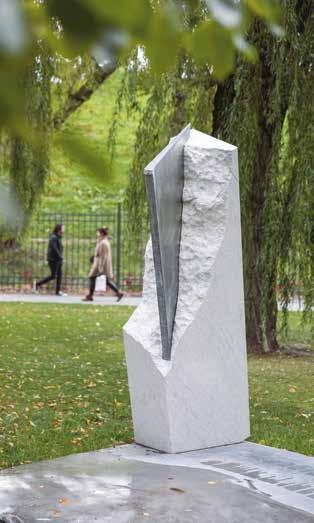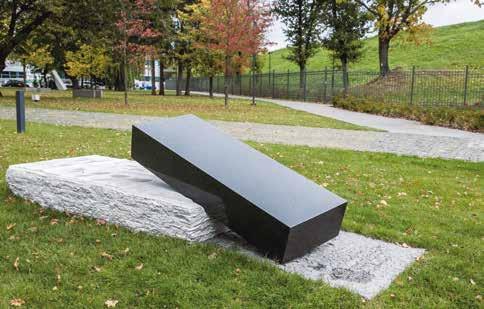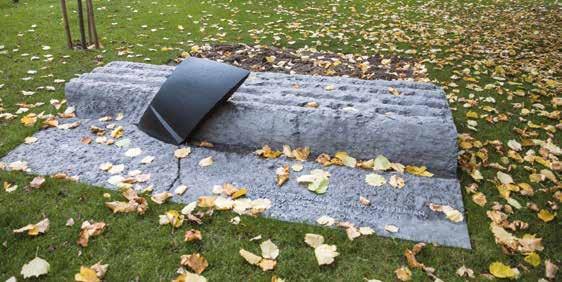 blok podłużnego kamienia. Jest prze chylony, jakby zawieszony w upadku. To bardzo wyrazisty symbol niewinnych ofiar zbrodni. Wbija się w niego wąski element, wykonany z zimnego meta lu, nawiązujący do okrutnej przemocy.