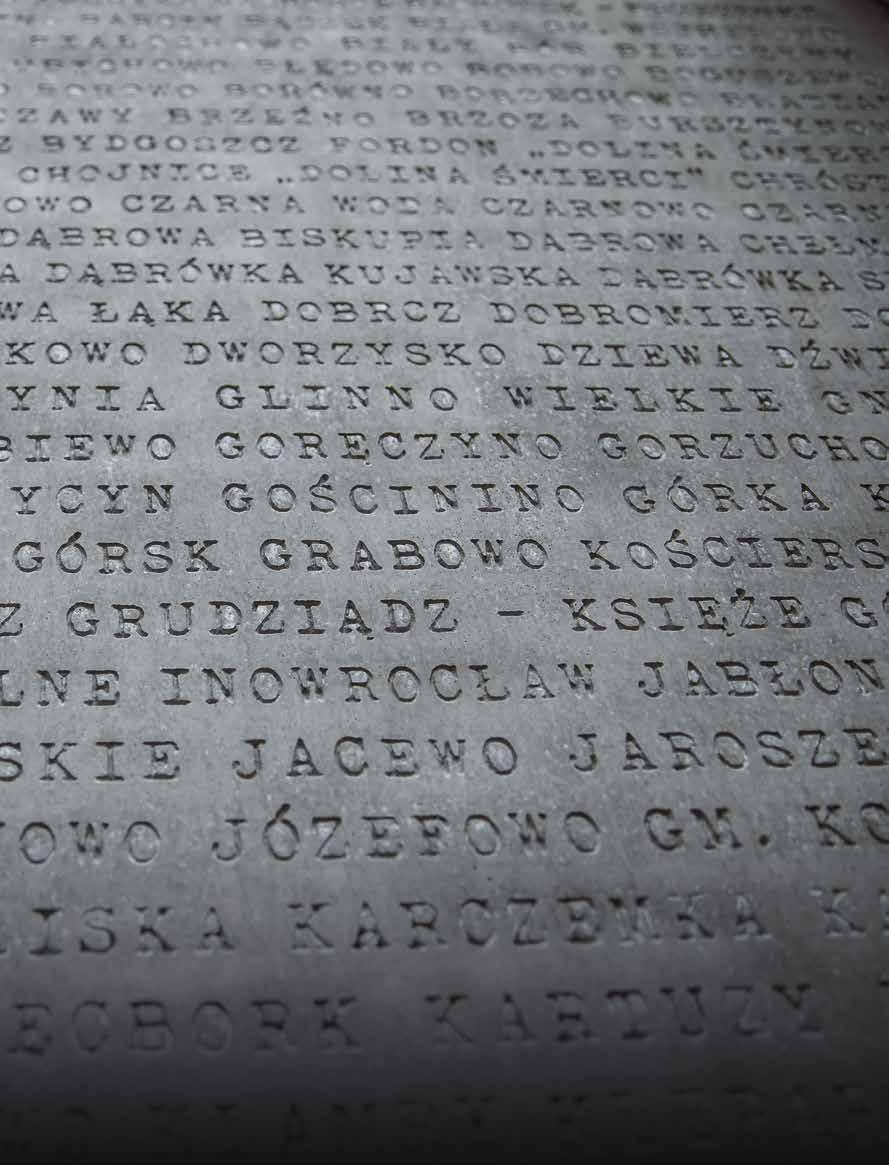 Jest jeszcze jedna rzecz: jeśli poje dziemy do Wejherowa i spytamy o Pia śnicę, to mieszkańcy będą wiedzie li, o co chodzi. Podobnie w Starogar dzie Gdańskim będą kojarzyć Szpę gawsk, a w Bydgoszczy większość bę dzie wiedziała, co się działo w Dolinie Śmierci. Ale że podobna dolina była w Chojnicach, masowe groby w Bar barce czy w Łopatkach koło Wąbrzeź na – o tym wie już niewiele osób. Wy nika to z faktu, że mamy ok. 400 miejsc zbrodni, w tym ok. 50 większych.