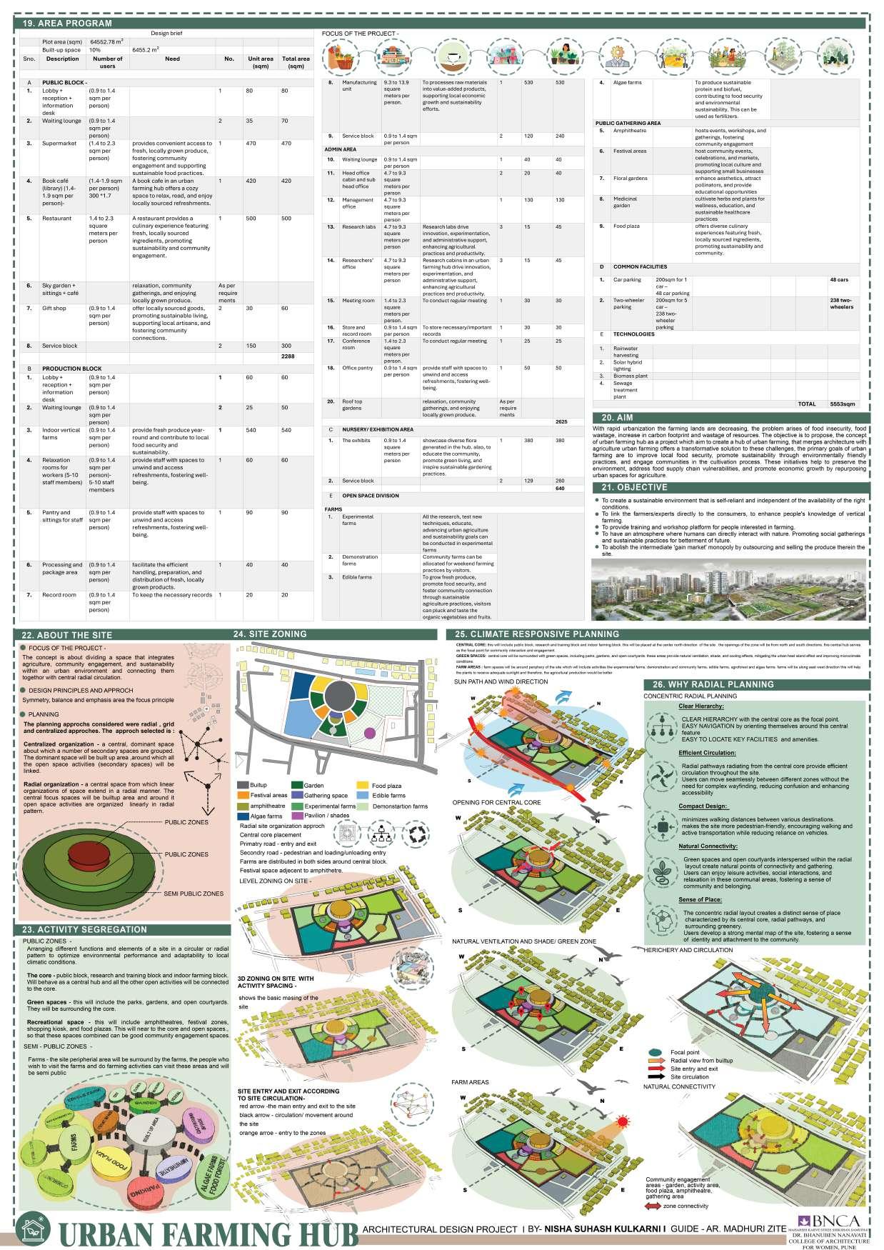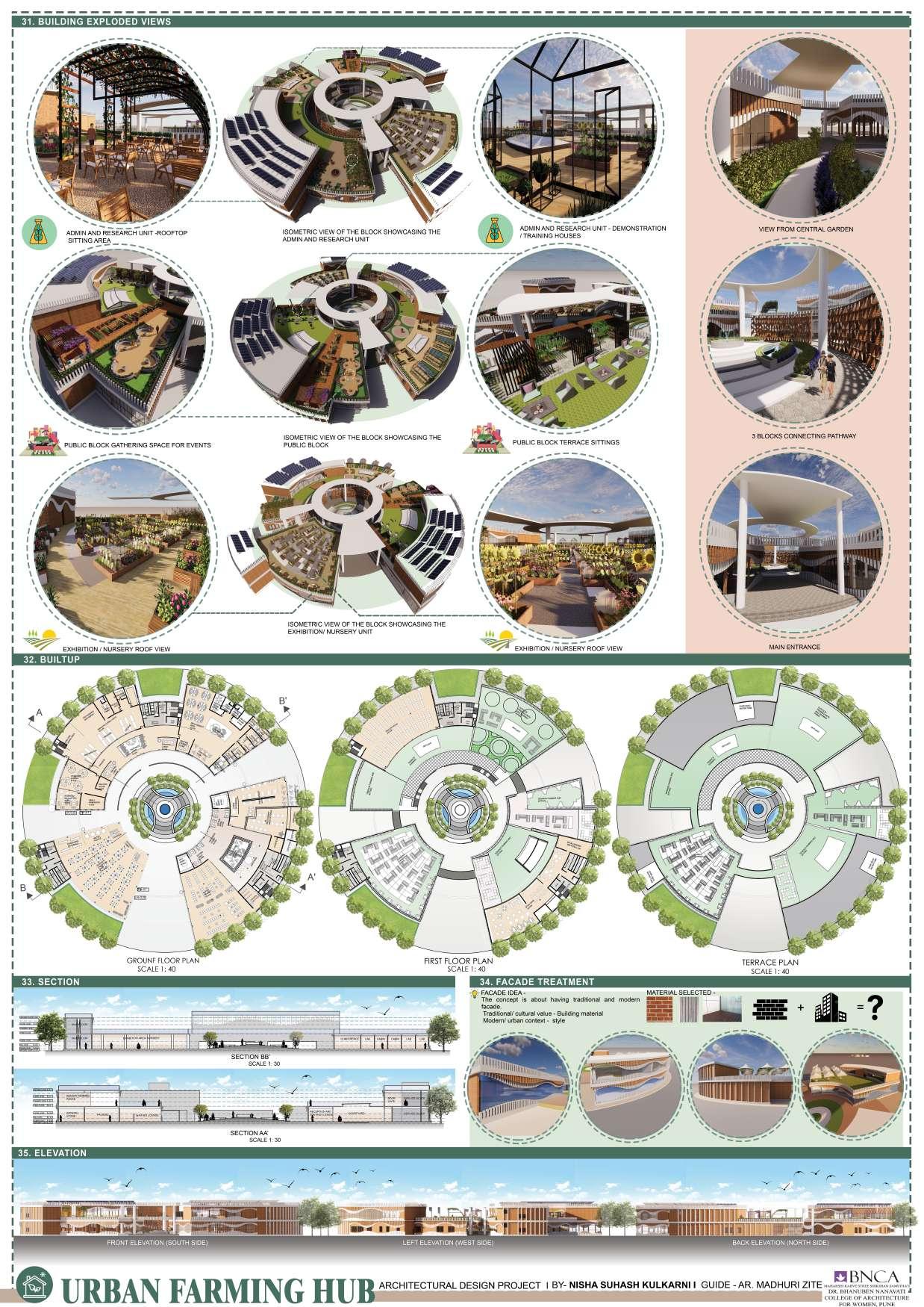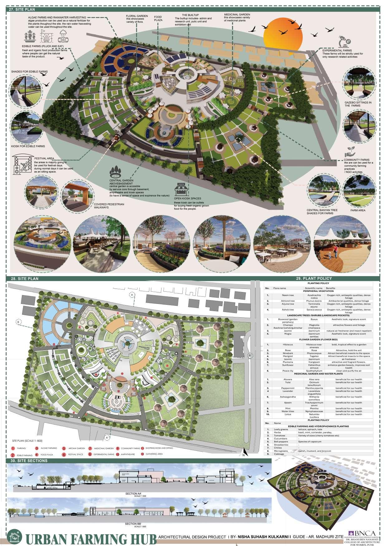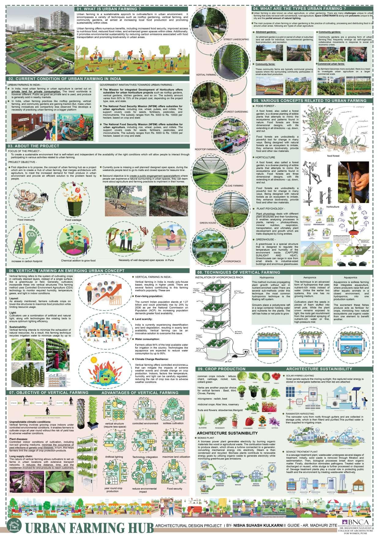 Urbanization brings both advantages and challenges for sustainable development. Due to this rapid urbanization, there is a need to have an innovative solution to address the challenges such as food security, mass food wastage, increase in carbon footprint, increase in transportation cost for food supplies, additions of harmful chemicals for the early growth of vegetables and fruits, and most importantly, community well-being. Currently, Pune does not have well-designed open spaces; people tend to go to malls/closed spaces for leisure time. This thesis is focused on establishing an urban farming hub that will cater to these issues and additionally provide a natural environment for the urban dwellers to learn more about farming and participate in various activities related to it.