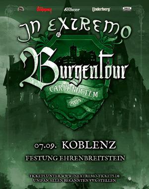 Unter diesem Banner werden die Spielleute von IN EXTEMO wieder durch die mittelalterlichen Burgen und Schlösser des Landes ziehen und ihr Publikum auf eine einzigartige Reise in ihre eigene musikalische Vergangenheit mitnehmen! Für 2024 werden die Sechs ein ganz besonderes Programm mit fulminanter Pyroshow und illustren Gästen für ihre Fans vorbereiten! Auf insgesamt zehn Burgen und Schlössern werden IN EXTREMO es wieder ordentlich krachen lassen!
