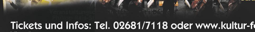 Tickets in Limburg (0 64 31) 98 06 19 · Wissen: (0 27 42) 18 74 Koblenz: (02 61) 33 4 93 · Vallendar: (02 61) 6 09 32 in allen bekannten Vorverkaufsstellen · Ticket-Hotline: (02 21) 2 803 50 Tickets online: www.rz-tickets.de oder www.kultopolis.com 5. Januar 2025 KOBLENZ 29. Dezember 2024 KOBLENZ #AnniversaryTour 20. Dezember 2024 LIMBURG 13. April VALLENDAR 11. Oktober 2024 VALLENDAR 15. Juni 2024 LIMBURG CELEBRATION TOUR 8. November 2024 WISSEN 2. November 2024 VALLENDAR 16. November 2024 VALLENDAR HEINZ RUDOLF KUNZE wie der Name schon sagt Vorverkauf demnächst Das KulturInfo im Internet: www.koblenzkultur.de