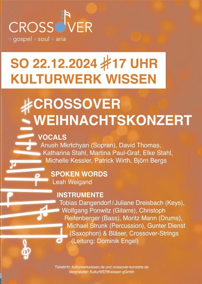 Mit der „Christmas Night“ lädt die Gruppe „Crossover“ ein zur Weihnachtsfeier für Jung und Alt, Familie, Freunde und Kollegen. Festlich wie besinnlich, voller Schwung, mit emotionalen Momenten, der Hoffnungsbotschaft von Weihnachten und leidenschaftlichen Musikern aus Soul, Klassik, Gospel, Kirchenmusik und Pop. Seit 2017 ist die Freudenberger Crossover-Formation unter der Leitung von Juliane Dreisbach mit Streichern, Bläsern, einem Gesangsensemble, Spoken Words-Performances und exzellenten Solisten an Weihnachten unterwegs und gestaltet seit 2019 auch die fulminante „Christmas for Friends“ Weihnachtsgala in der Siegerlandhalle mit.