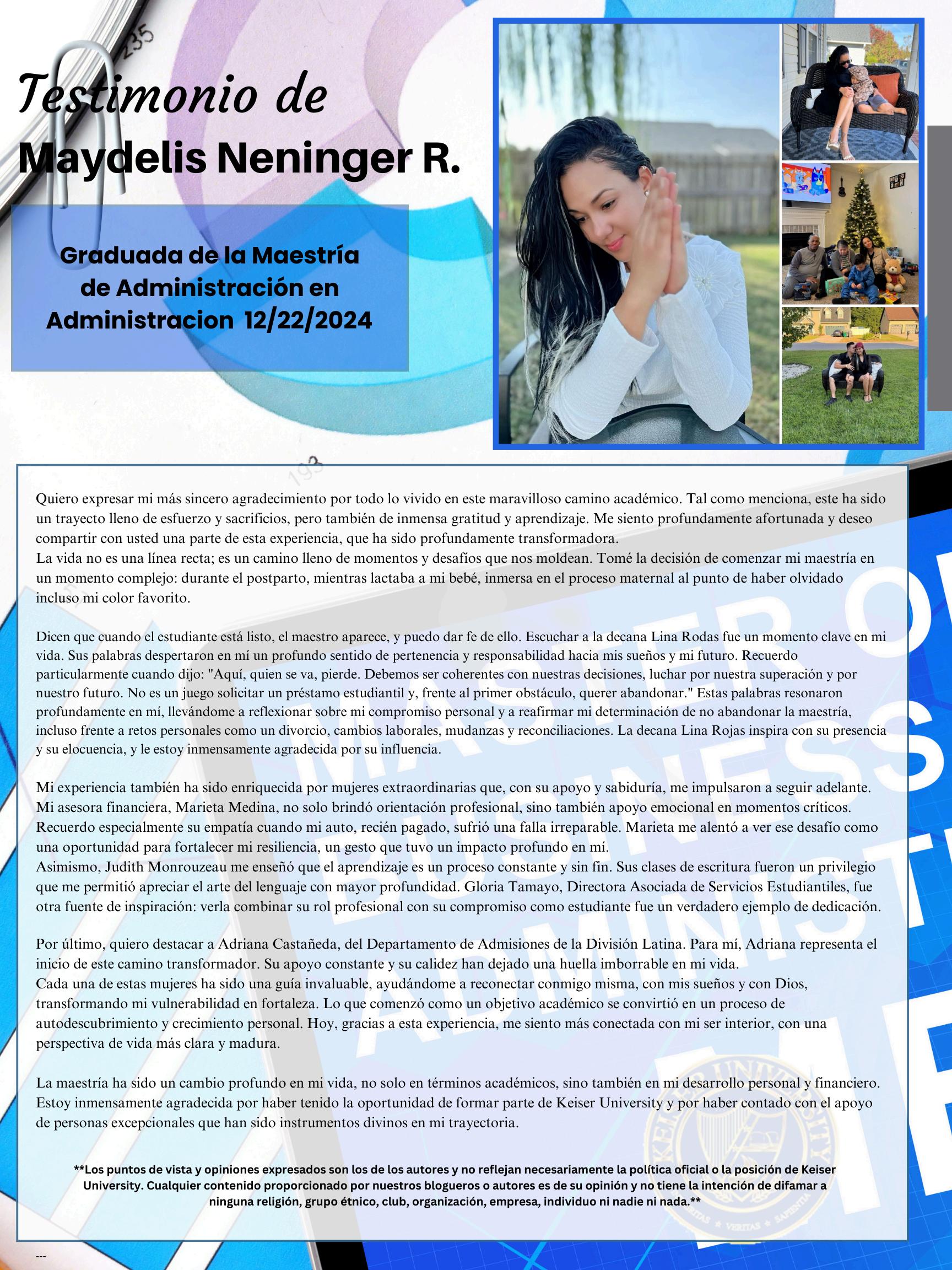 Actualmente, cuenta con una trayectoria de nueve años en Keiser University. Ingresó como Consejera de Admisiones para la División Latina y, posteriormente, fue promovida al cargo de Directora Asociada de Admisiones, función que desempeñó durante casi tres años. Ahora, como Decana Asociada, se encuentra profundamente comprometida con el éxito de los estudiantes y docentes, así como con la implementación de nuevas iniciativas en la División Latina.