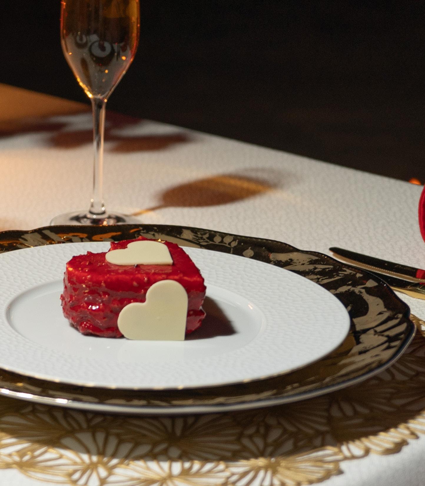 An elegant Valentine’s tasting menu featuring Wagyu Beef Tartare, Foie Gras Terrine, Carabinero Prawns with Oscietra Caviar, Delicate John Dory Fish, and Premium Black Angus Beef Tenderloin, concluded with an exquisite Cherry and Chocolate Dessert.