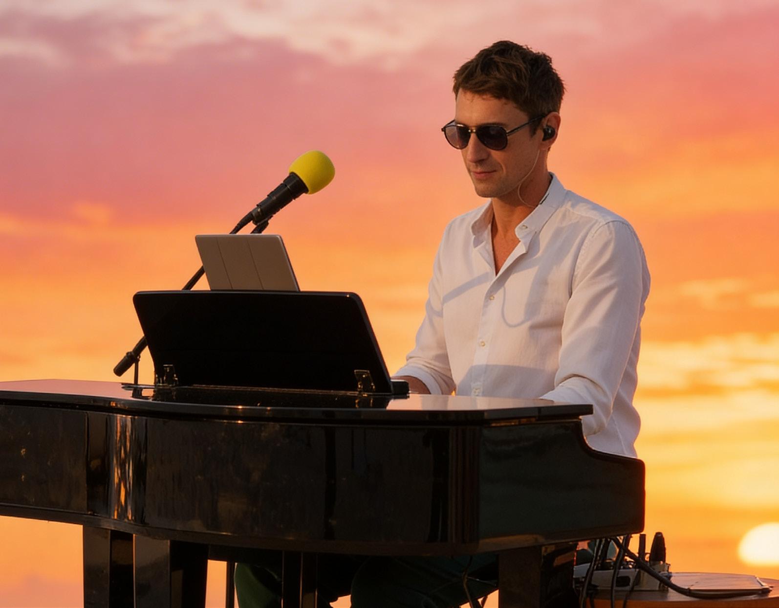 Sunset views by the pool, DJ at dusk and live piano during dinner, creating a relaxed and intimate atmosphere to unwind, connect, and savor the evening.
